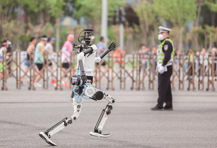 早上7时30分,随着发令枪响,人形机器人与人类跑者同时从起点出发。赛道中间设置隔离带进行安全分隔,双方共同完成21.0975公里的半程马拉松赛程。