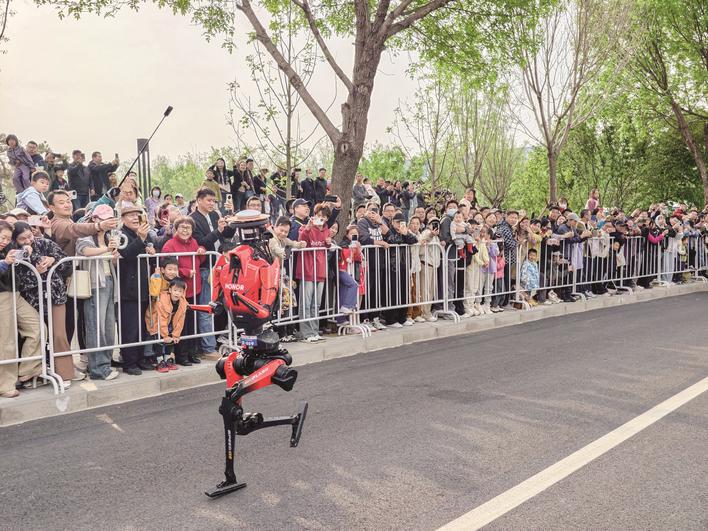 赛场上,参赛队各显其能:有的机器人势如闪电、速度惊人,有的机器人跑姿流畅、高度拟人,展现出不同的技术特点。