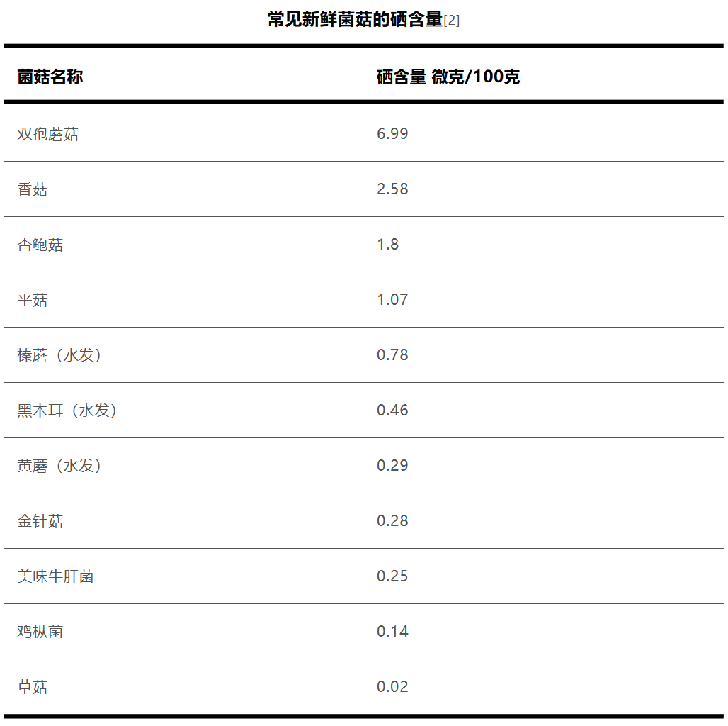口蘑是硒的良好食物来源,每100克新鲜口蘑的硒含量为 6.99微克,[2]几乎是常见菌菇中的第一名。硒属于一种人体必需的微量元素,是人体内多种抗氧化酶的关键组成部分,对于维持甲状腺功能和增强免疫力非常有益。
