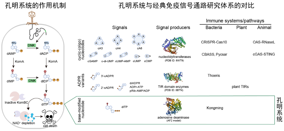 华中农业大学韩文元教授团队系统发掘细菌抗噬菌体免疫途径,发现了一类通过碱基修饰合成脱氧肌苷三磷酸(dITP)信号分子的细菌免疫系统。该系统“借用”噬菌体的脱氧核苷酸激酶(DNK)催化dITP合成的关键步骤,因而以草船借箭的典故,将其命名为孔明系统。dITP激活孔明系统效应复合体的NAD+降解活性,导致NAD+耗竭与代谢崩溃,从而诱导细胞死亡并抑制噬菌体增殖。同时,噬菌体能够通过降解dITP的前体dAMP抑制孔明系统,实现免疫逃逸。该成果突破了核苷酸类信号分子的经典研究体系,揭示了细菌与噬菌体在核苷酸代谢维度展开的新型分子博弈,为噬菌体的应用和分子检测工具的开发提供了新机遇。