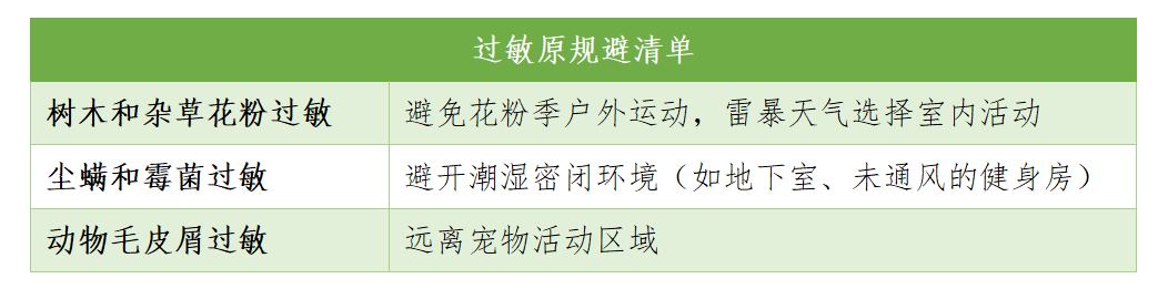 规避过敏原:哮喘患儿多为易过敏体质,哮喘患儿应根据自身过敏原致敏情况,在不同季节和时间选择适宜的运动环境。过敏原规避清单见下表。