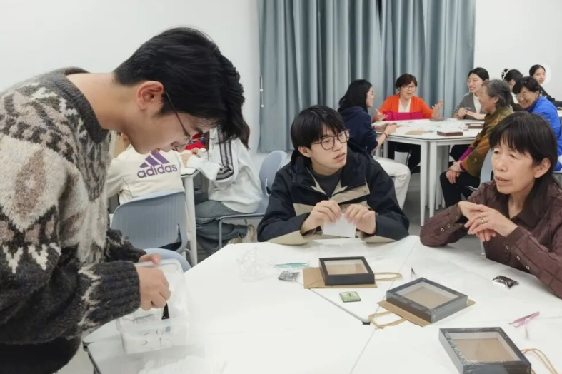 制作环节中,老教师们发挥细致耐心的优势,红杜鹃爱心社朝夕服务队的成员们也主动协助,大家分工协作、互帮互助。指尖翻飞间,一片片蝶翅被精心固定,一件件标本逐渐成型。生疏感在协作中消散,默契在交流中生长。大家专注于手中的作品,不时分享技巧、畅谈感受,教室里充满了欢声笑语。
