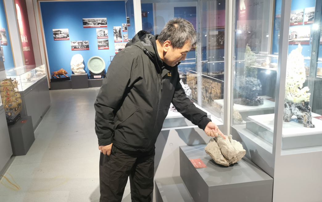 焦养泉在逸夫博物馆深情凝望着钙化木标本