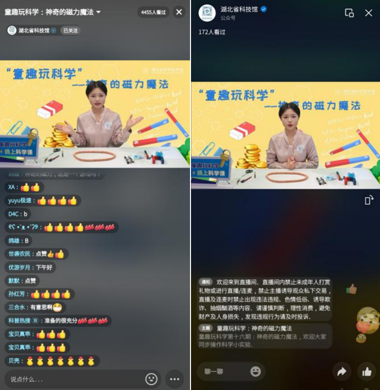 2月27日下午,湖北省科技馆开展“童趣玩科学”线上科学课第16期,主题为“神奇的磁力魔法”,线下在科普直播间进行,同步通过省科技馆抖音号、视频号直播,累计约5000人观看。