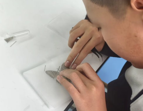 科普讲解后,蝴蝶标本制作体验正式开启。林老师细致讲解工具使用、展翅固定等步骤并现场示范,同学们手持工具,小心翼翼地调整蝴蝶翅膀角度、用昆虫针固定成型,每一步都格外认真。当一只只精致的标本在手中完成,大家脸上满是成就感,也在实操中加深了对自然生命的敬畏与珍惜。