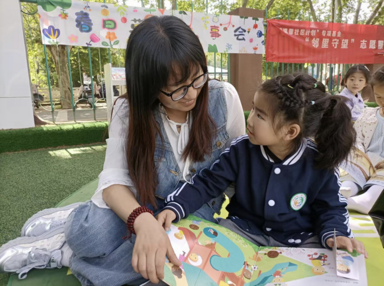 “从前,有一只小兔子,总想离家出走……”在亲子共读环节,家长们轻轻拥着孩子,低声诵读经典绘本,稚嫩的童声与温柔的朗读声交织,成为社区里最动听的旋律。有的家庭分角色演绎故事,孩子们模仿小动物的语气,逗得现场笑声不断;有的家庭静静依偎,在文字里感受美好、启迪心智。社区志愿者化身领读员,带着孩子们认识世界读书日,分享趣味阅读方法,引导大家爱上阅读、坚持阅读。