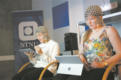 学生在手写和打字时接受脑电图检查。高密度脑电图使用256个织在网中并放置在头上的小传感器来测量大脑的电活动,每次提示都会记录5秒钟。图片来源:挪威科技大学