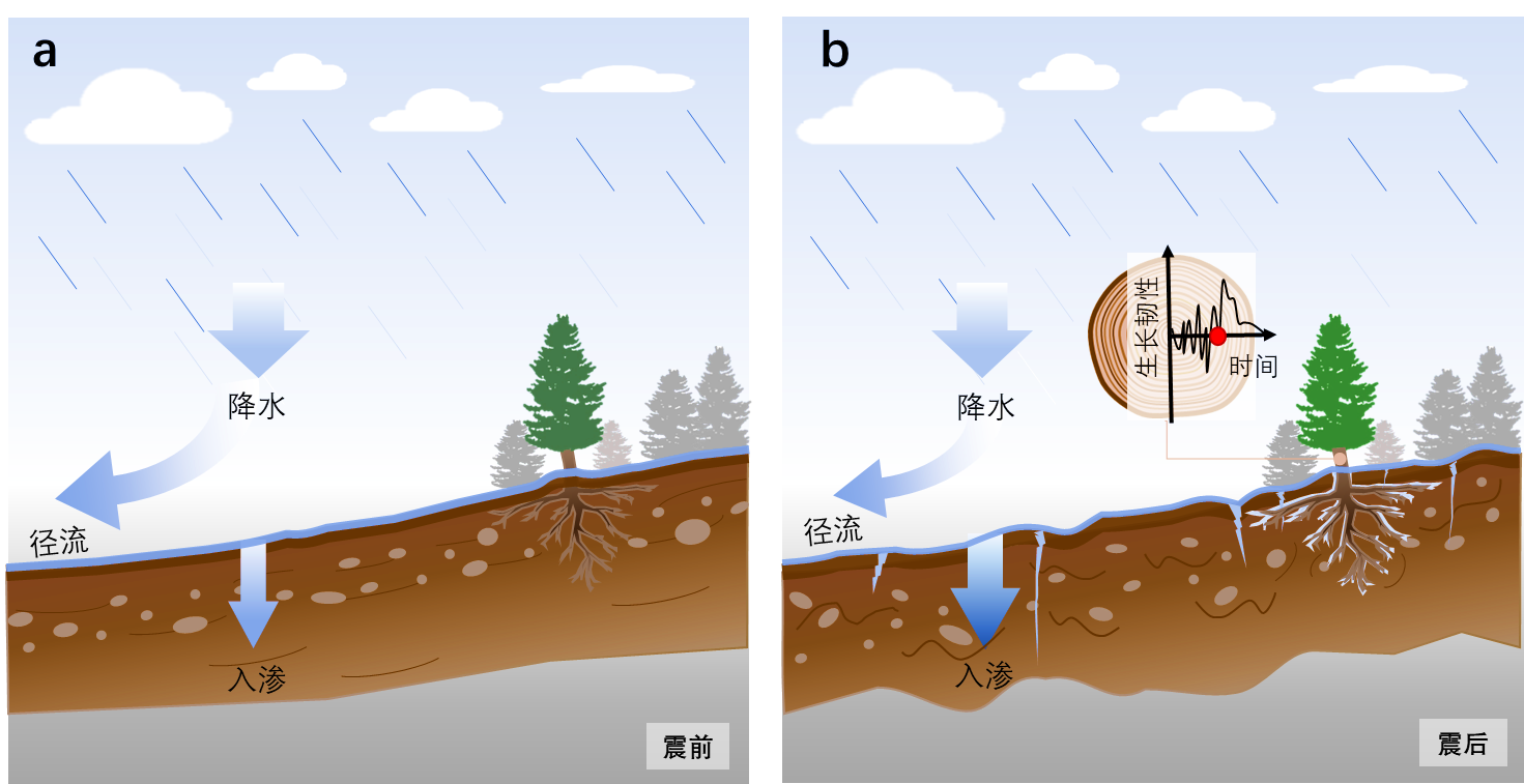中国科普网较干燥地区地震后土壤裂隙促进降水入渗从而增加树木生长韧性机理的示意图。中国科学院青藏高原所供图