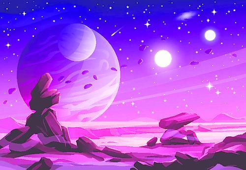 一颗荒凉而贫瘠的外星,背景是紫色的天空,以及恒星、行星、卫星、小行星等(艺术想象图)。 图片来源:美国《福布斯》双周刊网站