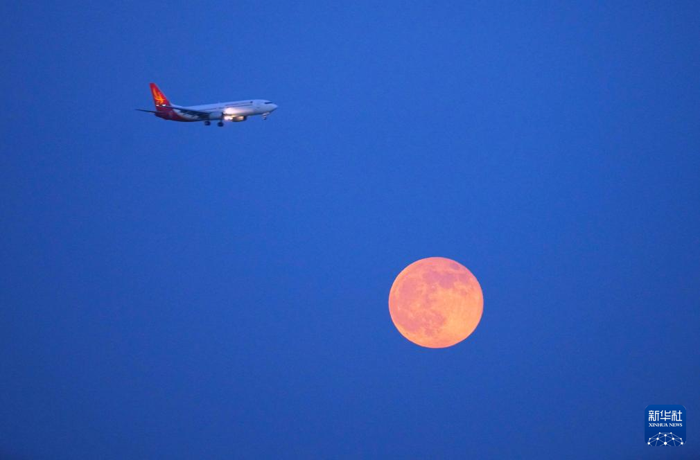 图为10月7日,在浙江省温州市龙湾区上空,一架飞机与月亮相映成趣。