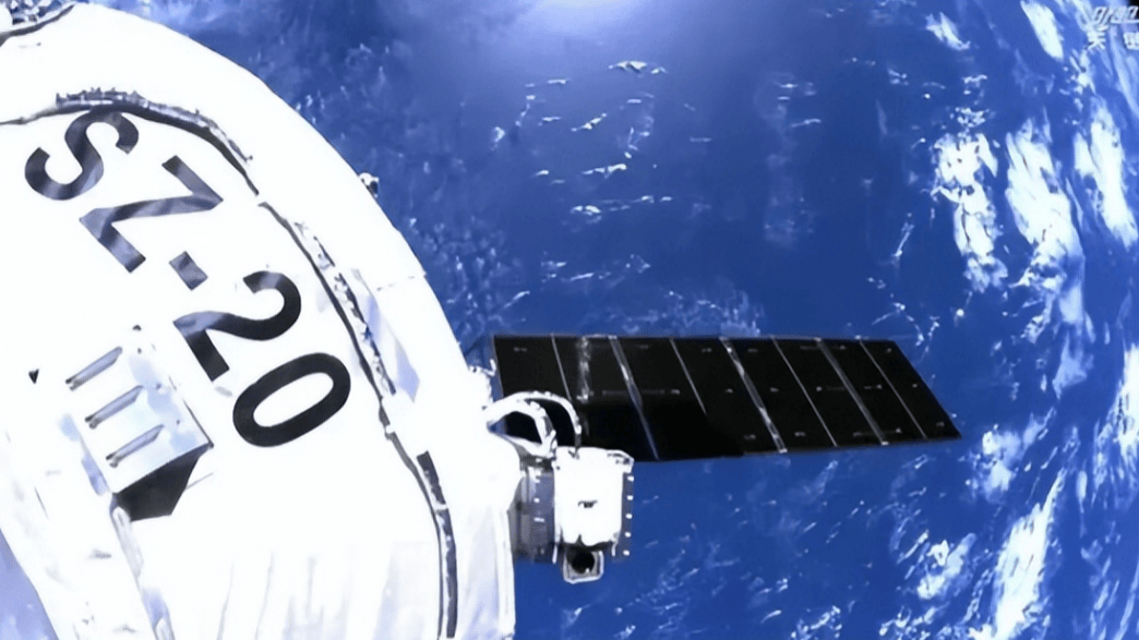 对接在空间站上的神舟二十号飞船 图片来源:央视新闻