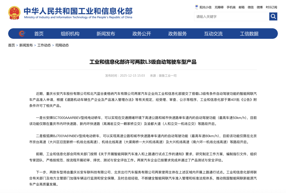 12月15日,工业和信息化部正式公布我国首批L3级有条件自动驾驶车型准入许可,两款分别适配城市拥堵、高速路段的车型将在北京、重庆指定区域开展上路试点。“对整个行业而言,这意味着我国自动驾驶正在从技术验证转向量产应用,从某个角度上来讲,则意味着我国自动驾驶的准入管理,迈出了关键一步。”工业和信息化部装备工业发展中心副主任刘法旺说。