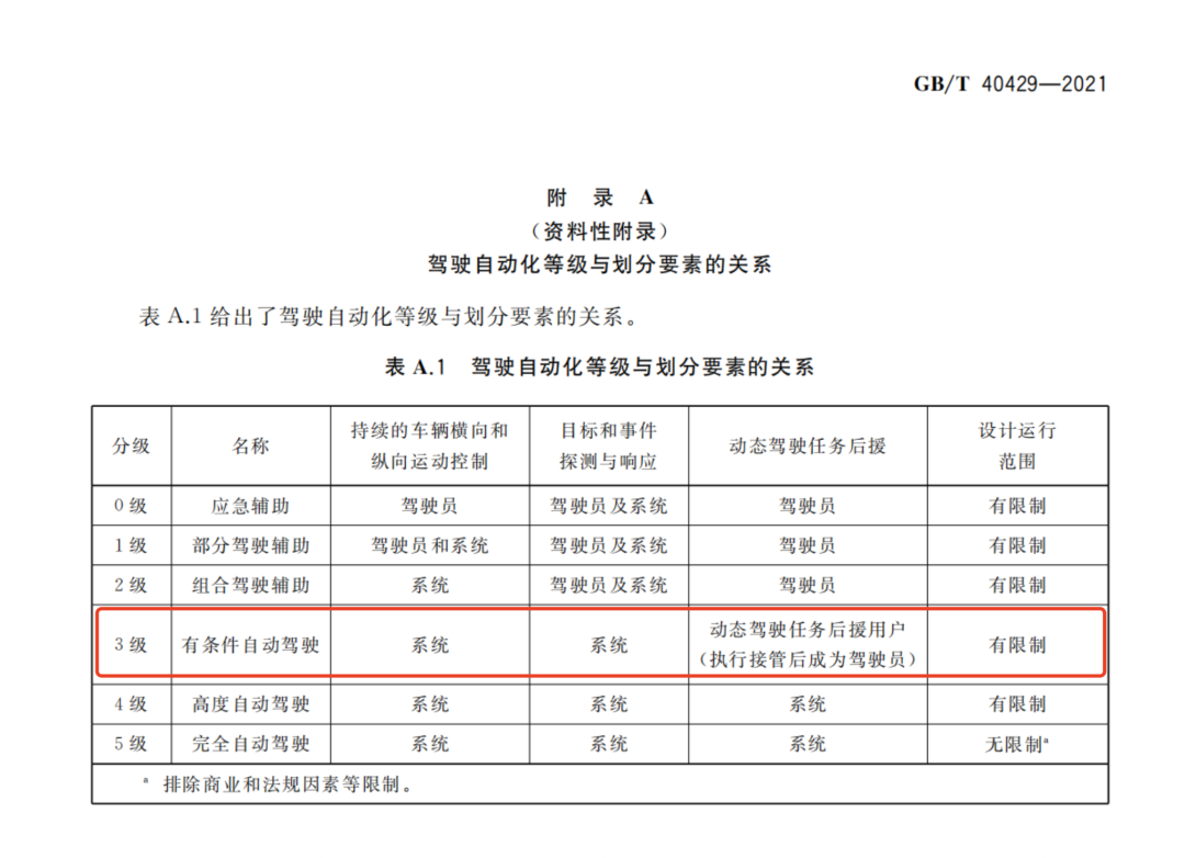 据GB/T 40429-2021《汽车驾驶自动化分级》显示,L3级定义为有条件的自动驾驶,即在设定的运行条件下,自驾系统可持续执行转向、加速、制动等动态驾驶任务,驾驶员无需持续监控行驶环境,但需要在系统发出接管请求时及时响应。