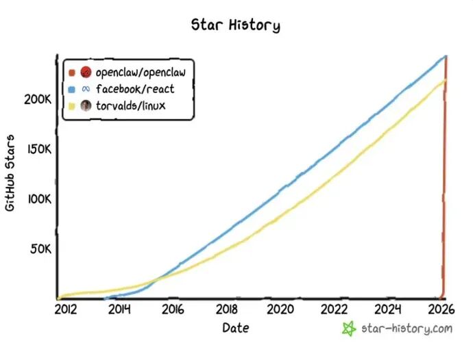 市场对龙虾的欢迎可称得上是疯狂。在全球最大开源软件平台 Github 上刚发布的 24 小时内,就获得 9,000 颗星标;随后的 72 小时内,星标数量飙升至 60,000 颗。到了现在,龙虾的星标总数已经是 Github 第一,超越了React 框架和Linux 内核(注:这两个都是拥有十余年甚至三十余年历史的超级项目,应用广泛,拥趸众多)。