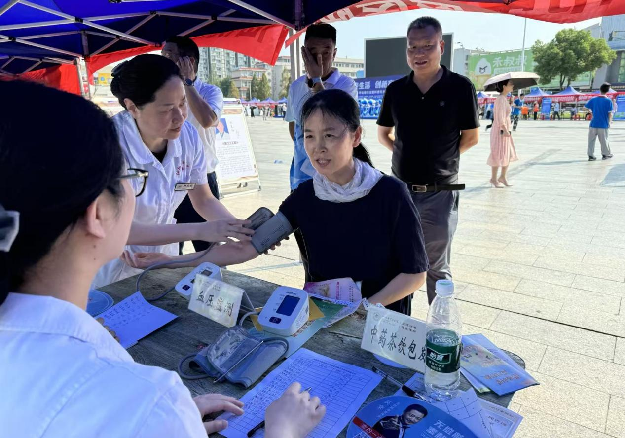 市卫健委的展位前,免费测量血压、血糖的服务台前排起了长龙。专家们细致地为市民提供健康咨询和初步诊断。