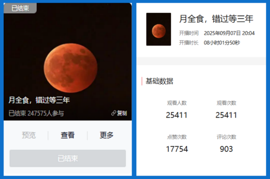 9月8日凌晨“月全食”上演,作为首个全国科普月中的最重磅的天象奇观,省科技馆在新媒体平台开启“科学之夜 同观月食”直播活动,9月7日20:00至9月8日4:00同步在省科技馆抖音号、视频号直播,超27万人同步观看,刷新了直播观看人数和同步在线人数的历史。