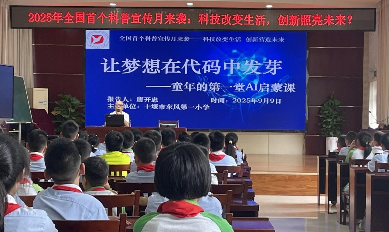 在2025年首个全国科普月期间,十堰市东风第一小学以“科技改变生活 创新照亮未来”为主题,推出系列科普活动。9月9日,由该校主办的“让梦想在代码中发芽——童年的第一堂AI启蒙课”精彩开讲,为百名学生开启人工智能探索之旅。