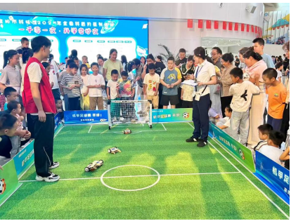 在“夜幕探索家”打卡区,孩子们穿梭在七大展厅,在闯关打卡过程中体验科学原理,各类与生活常识、公共安全息息相关的小小知识点伴随打卡的文创戳章印入孩子心中。机甲足球赛区域气氛热烈,四台迷你机甲在微型球场上竞技,孩子们通过手柄操控进攻防守。