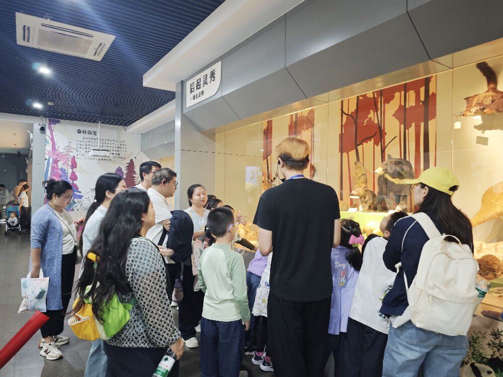活动伊始,35组亲子家庭在工作人员的引导下走进华中农业大学博物馆。博物馆陈列着丰富的动植物标本、矿物样本及农耕文化遗产,宛如一部立体的“自然百科全书”。孩子们簇拥在展柜前,好奇地观察着栩栩如生的昆虫标本、形态各异的种子果实,以及珍贵的野生动物复原场景。通过观察植物分类、生长习性、生态作用,从学习的视角获得新的知识。博物馆讲解员通过生动有趣的解说,为亲子家庭揭示了自然界中动植物、矿物、生态等的生物多样性的奥秘与农业科技的发展历程。家长纷纷表示,这种沉浸式的参观体验不仅拓宽了孩子的视野,更激发了他们对自然科学的兴趣。