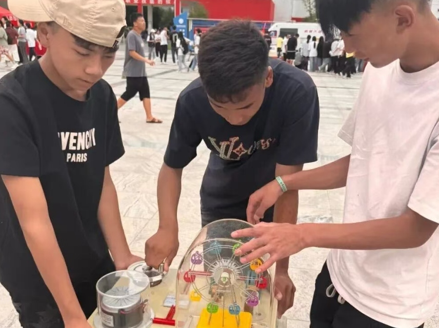 上午九点半,学校正式进入专属的“科普时间”。在校师生迫不及待打开了“科普大礼包”:有的逐一打卡科普大篷车搭载的趣味科普展品,体验可触摸、可感受、可玩耍、可学习的科学知识;有的围成一圈,研究灵动的机器狗和机甲大师,观看炫酷的无人机表演;有的则对各展位的科技创新成果产生了浓厚的兴趣……