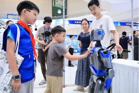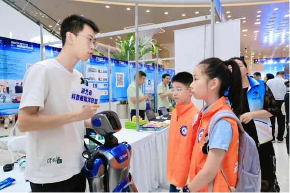 在2025年湖北省暨武汉市全国科普月活动启动仪式现场,孩子们或驻足围观无人机,或围在机器人旁好奇互动,一张张笑脸上满是对科学的向往。
