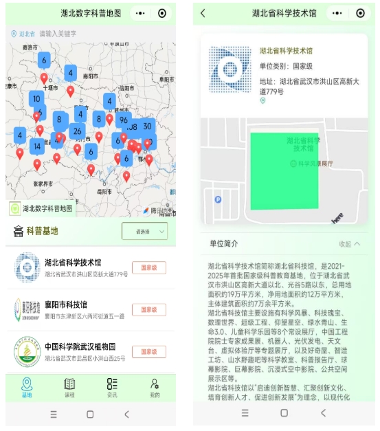 湖北数字科普地图是面向大众用户、政府服务部门、科普场馆和教育基地的智能服务平台。地图共有四大板块,分别为基地板块、课程板块、资讯板块、个人板块,各板块有不同功能及作用,并创新性地采用融媒体方式为公众提供包括科普场馆和教育基地的导览、基于位置的智能导航、科普场馆参观指南以及科普活动报名等服务;为科普场馆和教育基地提供包括信息发布、课程安排、资源展示、信息汇总等服务。